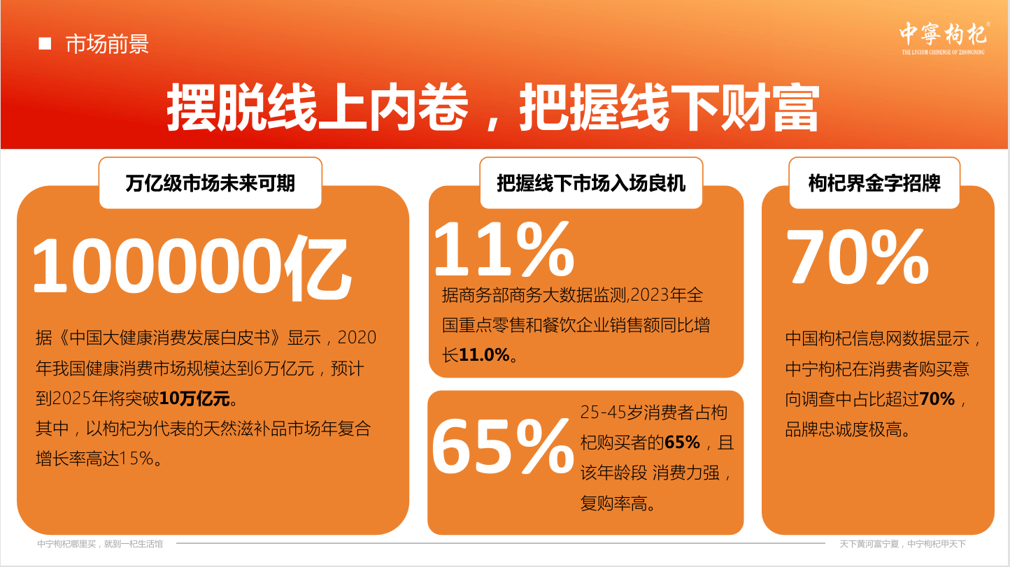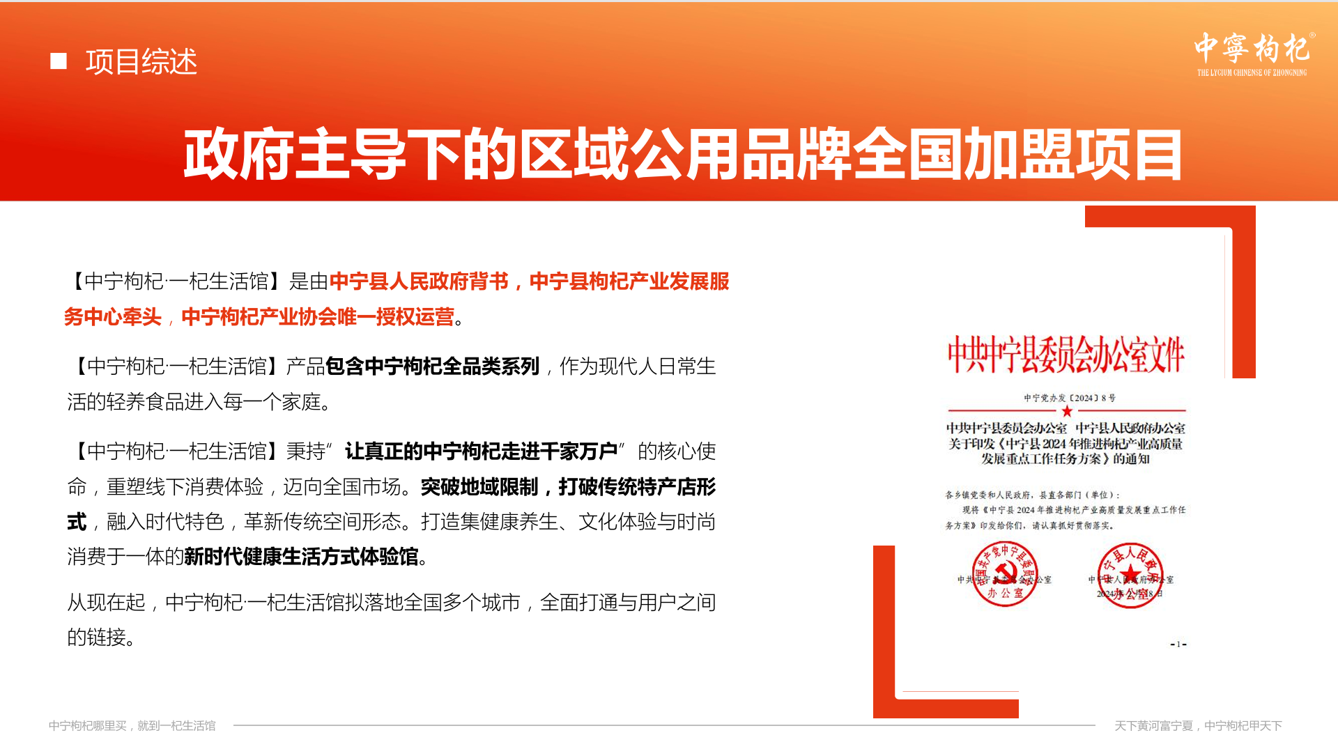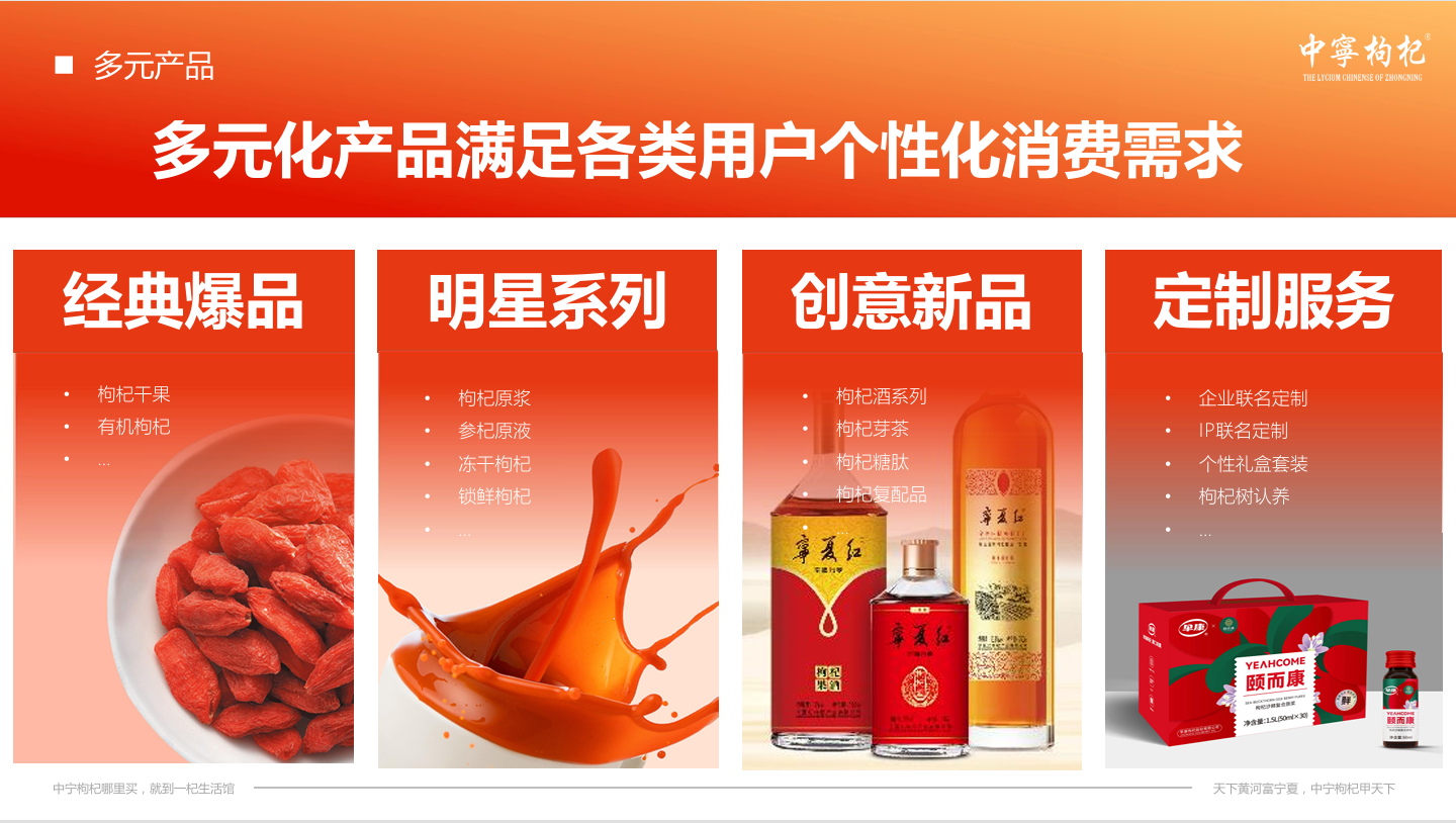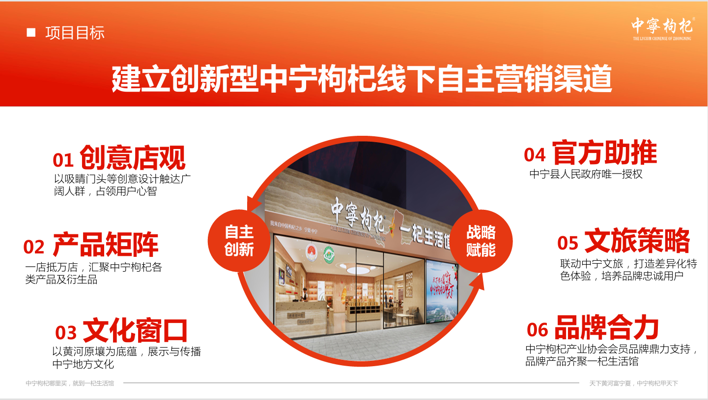 【中寧枸杞·一杞生活館】產(chǎn)品包含中寧枸杞全品類系列,作為現(xiàn)代人日常生 活的輕養(yǎng)食品進入每一個家庭?!局袑庤坭健ひ昏缴铕^】秉持“ 讓真正的中寧枸杞走進千家萬戶” 的核心使 命,重塑線下消費體驗,邁向全國市場。突破地域限制,打破傳統(tǒng)特產(chǎn)店形 式,融入時代特色,革新傳統(tǒng)空間形態(tài)。打造集健康養(yǎng)生、文化體驗與時尚 消費于一體的新時代健康生活方式體驗館。